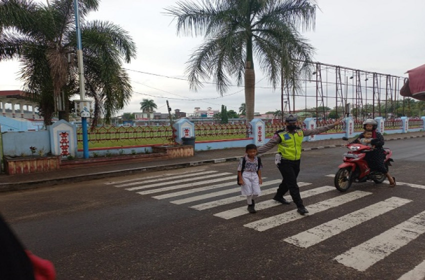 Polisi Bantu Anak Sekolah Menyebrang Jalan