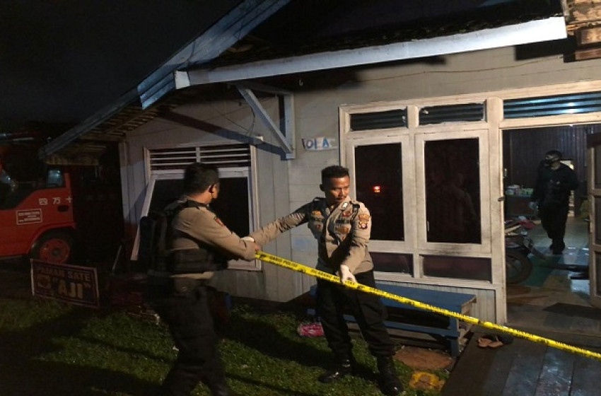 Petugas saat memasang garis polisi di lokasi tempat kejadian perkara