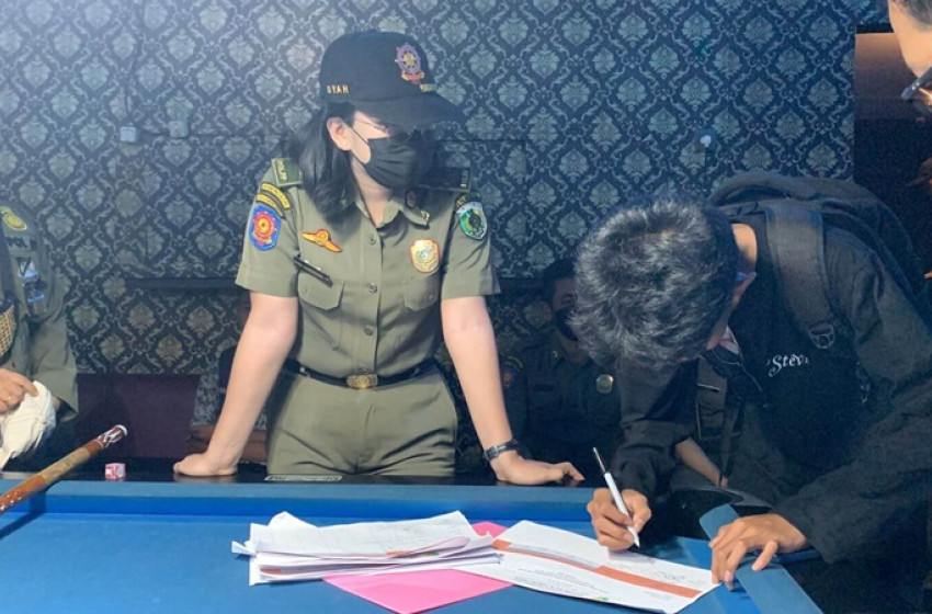 seorang pelajar nampak terpakasa menandatangani surat pernyataan tidak membolos diatas meja bilyard saat razia Satpol PP di Palangka Raya, Senin (30/10/2023).