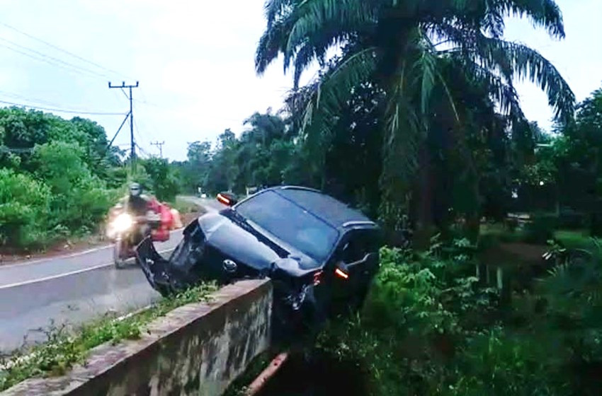 Mobil Kadishut Kalteng Agustan Saining yang mengalami kecelakaan tunggal di Desa Jemaras, Kecamatan Cempaga, Kabupaten Kotawaringin Timur, Kamis (16/4/2026). (Foto: Ist)