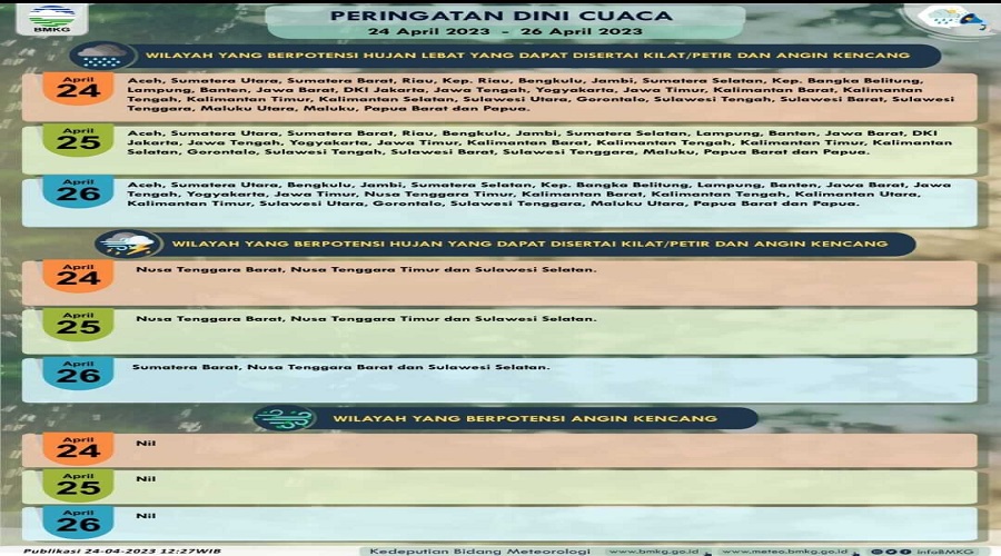 Prakiraan cuaca Republik Indonesia periode 24 April hingga 26 April (BMKG)