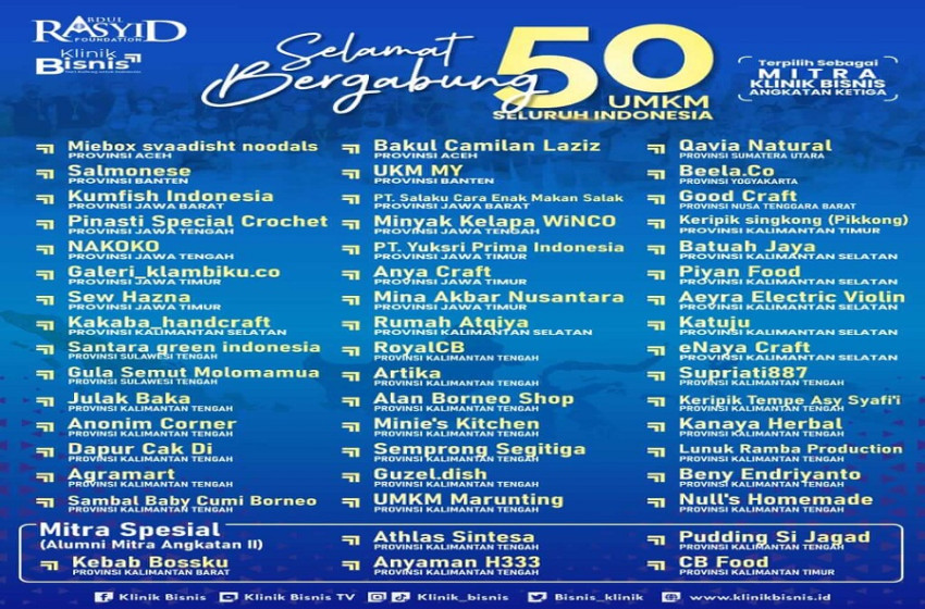 Daftar 50 UMKM se-Indonesia yang behak menjadi mitra Klinik Bisnis Angkatan 3 Tahun 2023 (Foto:Klinik Bisnis)