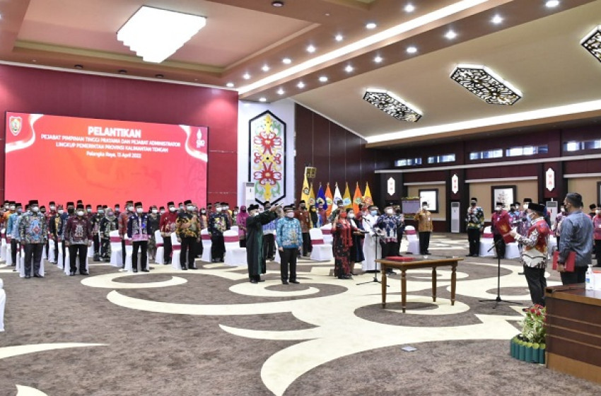 PALANGKA RAYA - Gubernur Kalimantan Tengah (Kalteng) H. Sugianto Sabran Melantik dan Mengambil Sumpah/Janji Pejabat Pimpinan Tinggi Pratama, Pejabat Administrator, dan Pejabat Fungsional di Lingkungan Pemprov. Kalteng Tahun 2022. Pelantikan berlangsung di Aula Jayang Tingang, Kantor Gubernur Kalteng, Rabu (13/4/2022).
