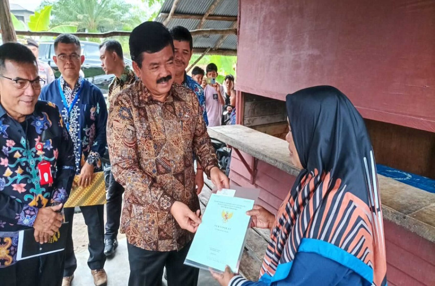 Menteri ATR/BPNMarsekal (Purn) Hadi Tjahjanto saat menyerahkan sertipikat tanah warda Desa Banturung, Kecamatan Bukit Batu, Palangka Raya, Kalteng, Jumat, 24/3/2023 (foto : kontenkalteng.com)