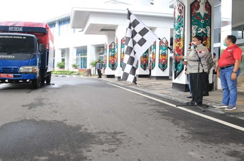 Wakil Gubernur Kalimantan Tengah H. Edy Pratowo melakukan lepas bantuan untuk 80 Kepala Keluarga Kelurga (KK) korban kebakaran Desa Pundu Kecamatan Cempaga Hulu Kabupaten Kotawaringin Timur, di Lobi Kantor Gubernur Kalteng, Jumat (21/1/2022).