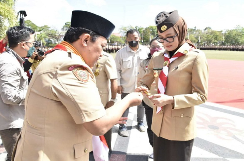 ganugrahan Tanda kehormatan gerakan Pramuka disematkan langsung oleh Wakil Ketua Mabida Gerakan Pramuka Kalteng H. Edy Pratowo.